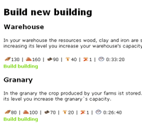 بعد العنايه بإنتاج الموارد الخام، يمكنك البدء في تطوير قريتك. في المخزن و مخزن الحبوب، يمكنك تخزين كمية أكبر من الموارد الخام. المخبأ يحمي مواردكم من نهب الاعداء. |